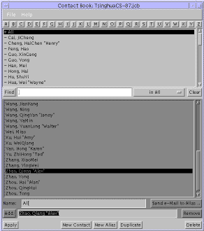Quick search buttons on the top of the contact book window allow the user to search for names starting with the character on the search botton. A find button in the middle will search through the contact book for strings containing whatever the user types in the text field besides it.