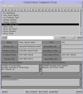 If a match is found, the contact book manager highlights the corresponding record in the list and displays contact information associated with that record in the darker data area at the bottom. Clicking on the URL or e-Mail buttons brings up the Netscape Navigator so the user can visit the URL or send e-mail to that address. The user can edit various fields and hit the Apply button to make the change.