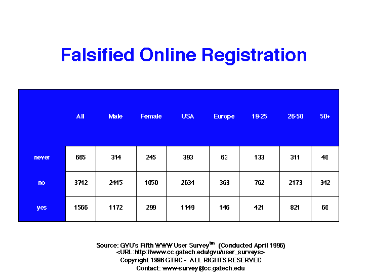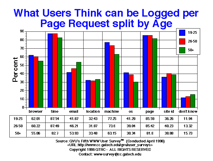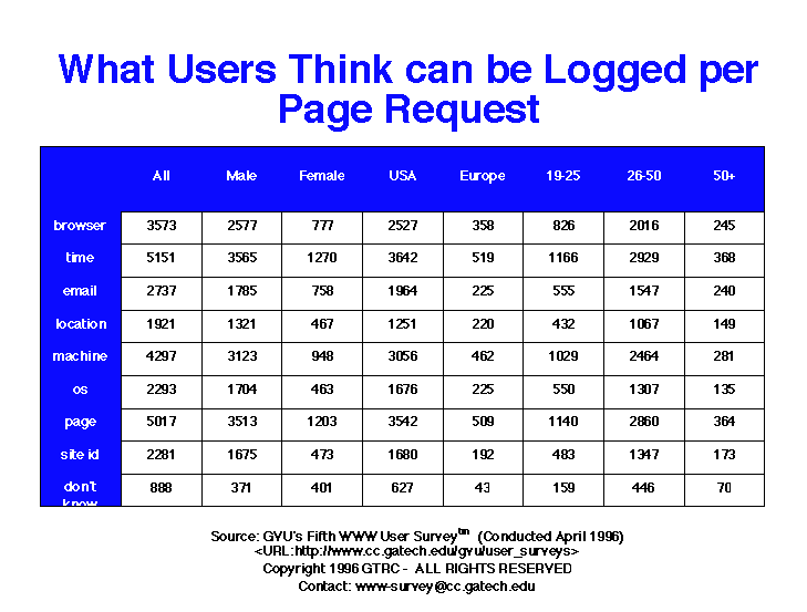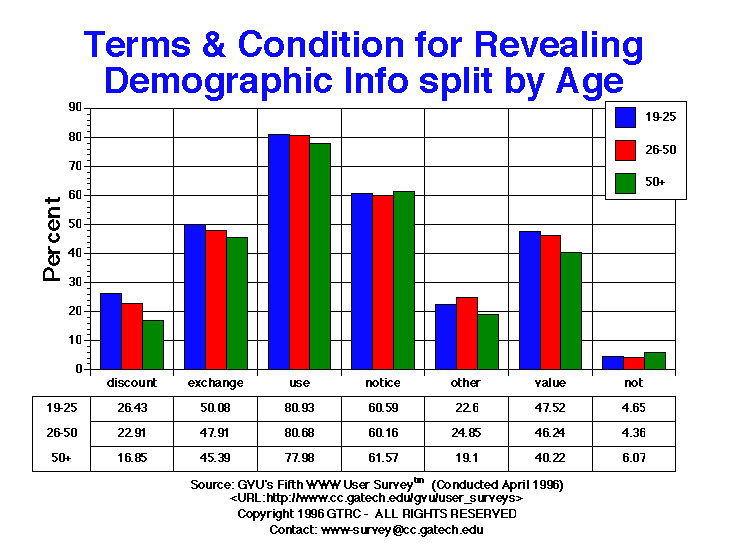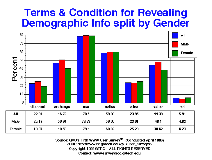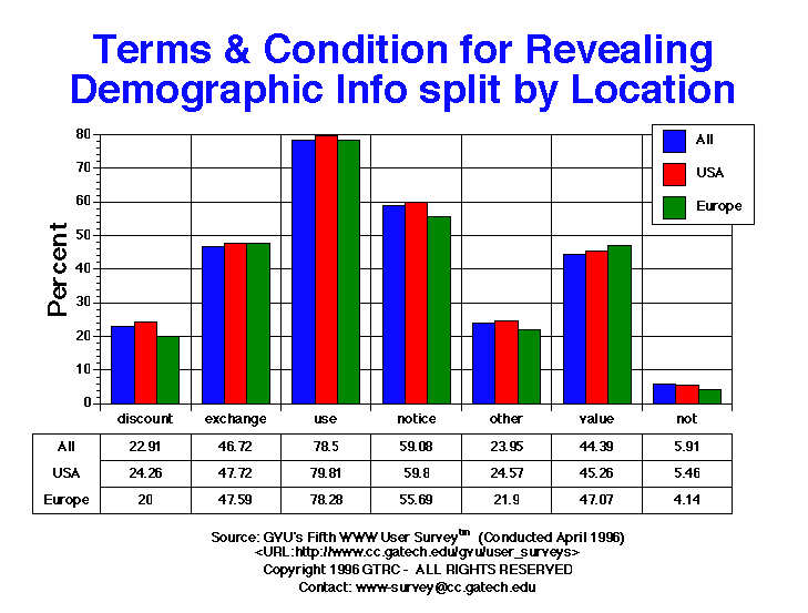 Other conditions that respondents were somewhat less agreeable to were: "for some value added service (e.g. notification of events)" ("value", 44.4%) and "in exchange for access to the pages on the Web site" ("exchange", 46.7%). Interestingly, this suggests that respondents are more concerned with their right to control demographic information, than any compensation they might receive for revealing it.