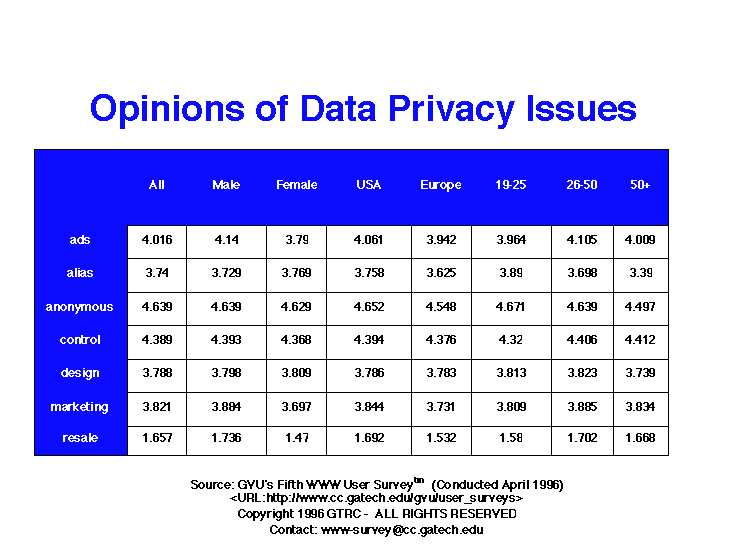 "ought to be able to take on different aliases/roles at different times on the Internet" (3.7). But they strongly disagreed with the idea that "content providers have the right to resell information about its users to other companies" (1.7).