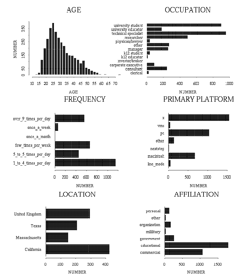 Figures 3 through 8. Contrary to popular belief, the distribution of ages of WWWW users does not fit a normal distribution. Technical professionals and university students together comprise the majority of the user population, with most users utilizing their WWW browser one to four times a day. The most widely used platform is X/UNIX, followed by PCs and Macintoshes. The graph of location represents the top four locations of uses, with California accounting for nearly one seventhe of all respondents. Finally, most users are either affiliated with educational institutions or commercial organizations.