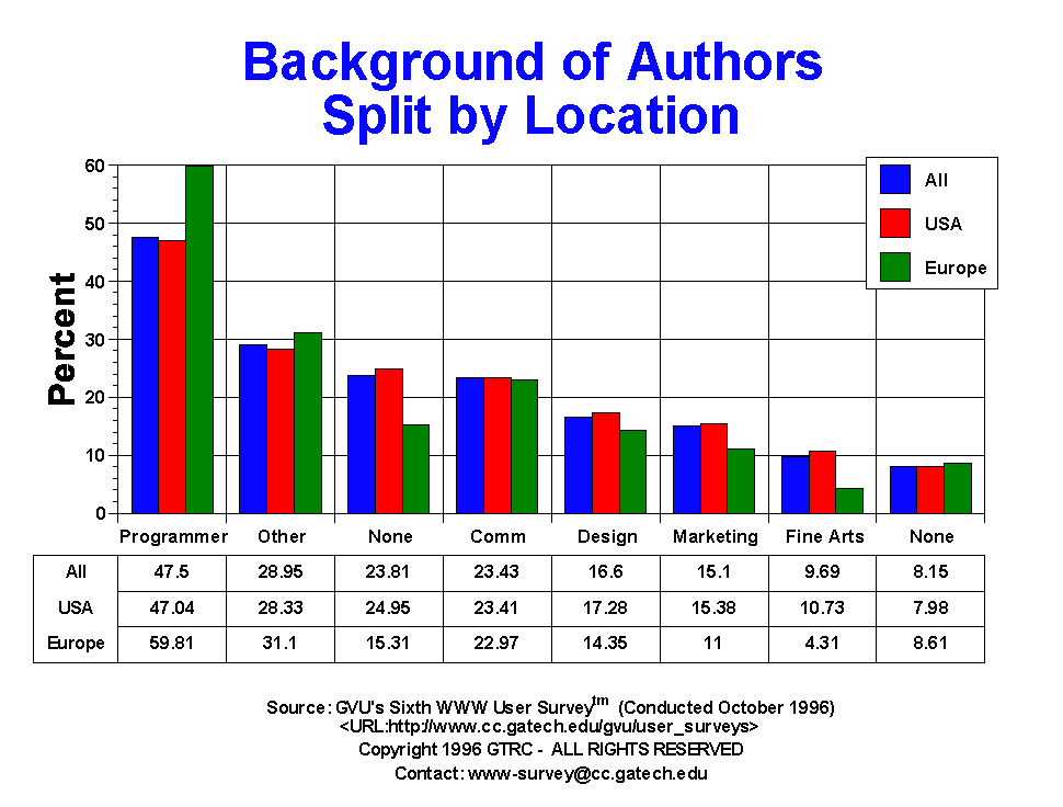 - Almost half (47.5%) of respondents had some formal training in programming. A programming background was especially common among European respondents (59.8%). About a quarter had training in communication but very few have training in graphic design or fine arts.