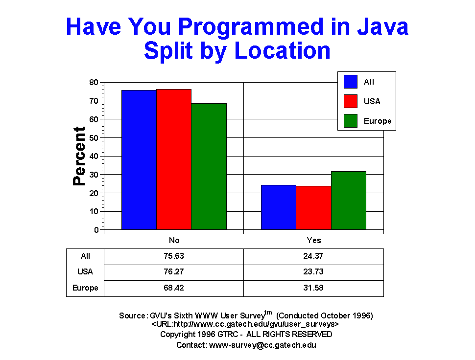 - A higher percentage of Europeans have used Java, probably because of their stronger programming backgrounds.