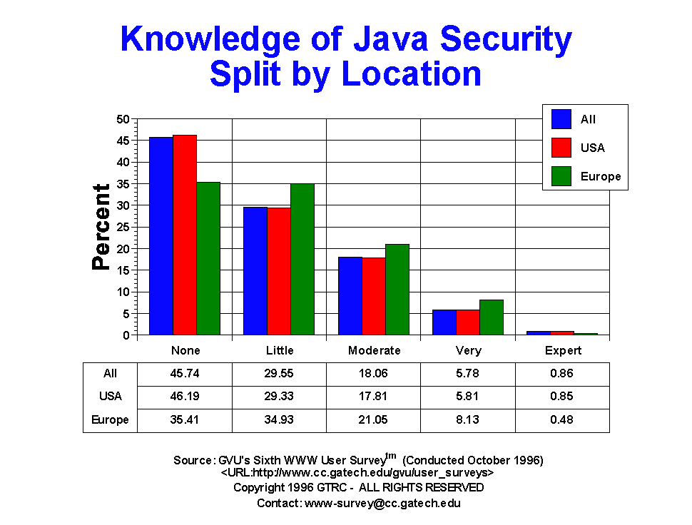 - For this question, authors were asked to rate their knowledge of Java's security measures as: "None at all", "A little (e.g. could list some of them)", "Moderate (e.g. have read the white paper)", "A lot (e.g. have a thorough understanding of flaws recently found)", or "Expert (e.g. have written code to test them) ".