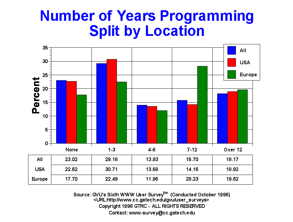 - The percentage of respondents with less than 7 years of programming experience has risen again slightly to 66.1%. The percentage with no programming experience has also risen slightly to 23.0%.