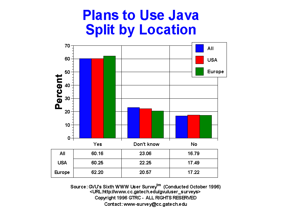- Almost 2/3 of web authors say they have not used ready-made Java applets. European respondents are slightly more likely to have used them.