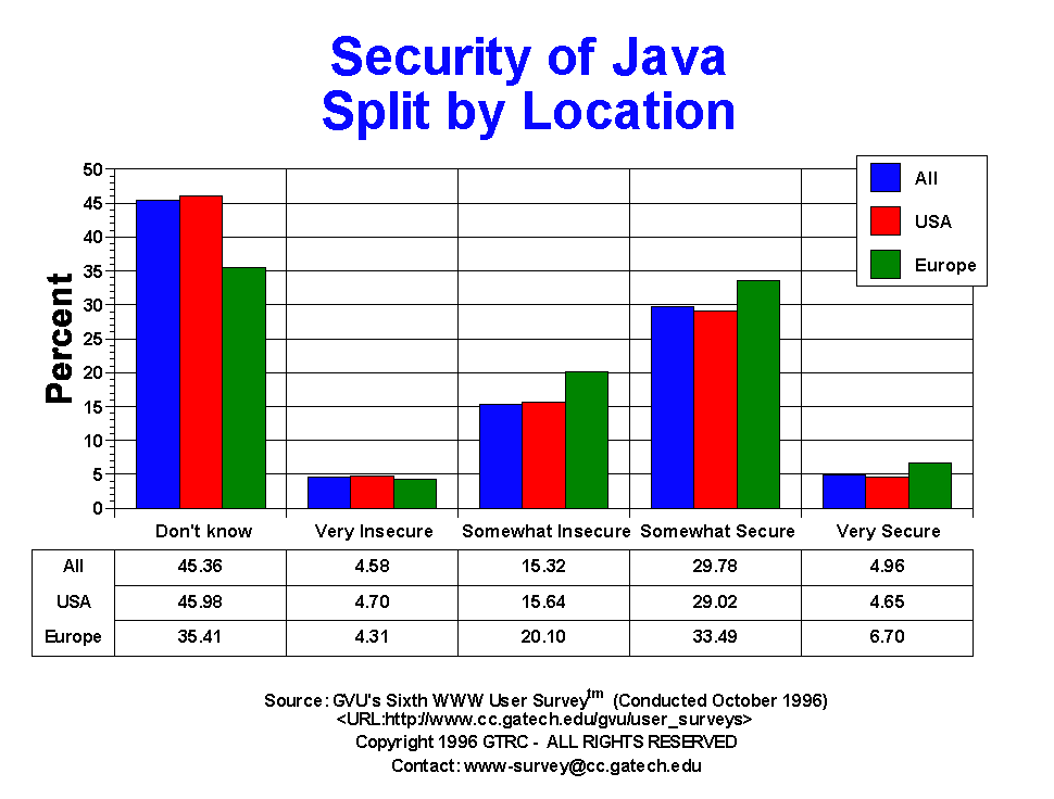 - The largest category of users said that they didn't know how secure Java was (45.4%). Of those who gave it a rating, 8.3% thought it was very insecure, 28.0% said somewhat insecure, 54.5% said somewhat secure and 9.0% thought it was very secure. This represents a distinct shift toward more trust in Java's security measures from the Fifth survey.