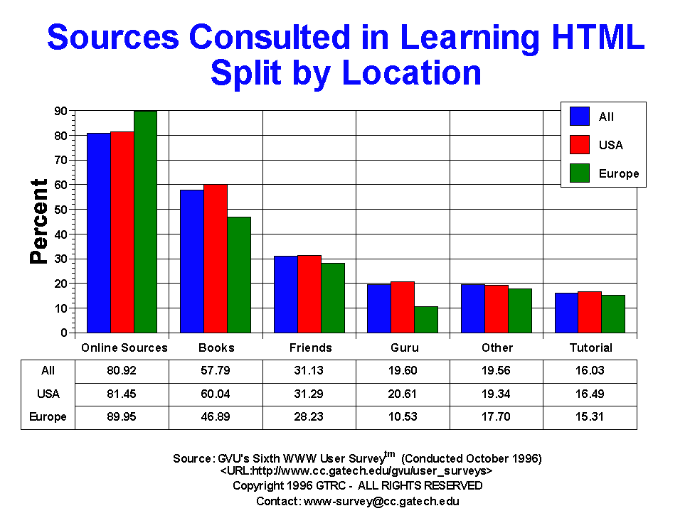 - All categories except online sources showed a slight increase from the Fifth survey. Online sources and books are still the most popular ways for people to learn HTML.