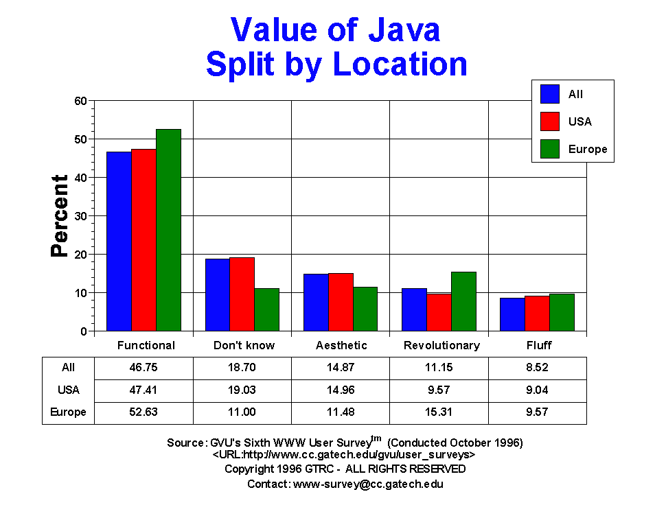 - Of those who had an opinion, more than half (57.5%) saw the value of Java as mainly functional. As with the fifth survey, almost 30% feel it is mainly aesthetic or adds no value to the web.