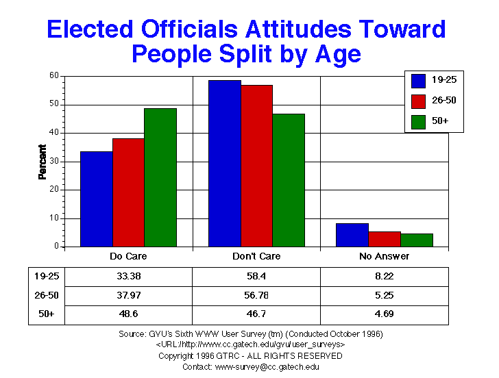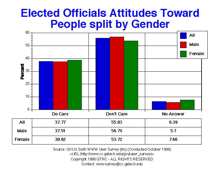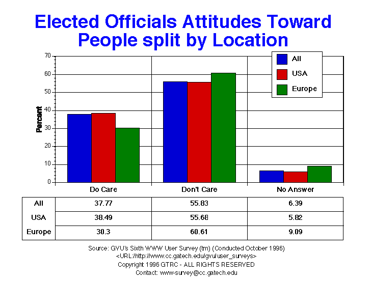- Once again, the percentages are nearly identical to the Fifth survey. 40.4% of respondents felt that elected officials did care what people like them thought and 59.6% felt they did not. There was a slight increase in the percentage of Europeans who felt that officials didn't care what they thought. Older respondents were more likely to think that officials did care what they thought.
