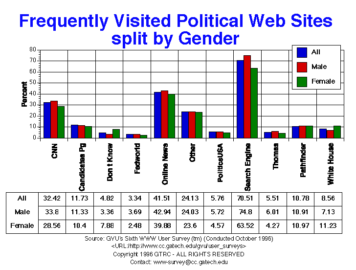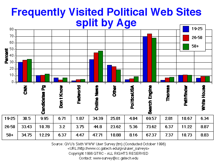 - This question included the choice "search engine" to provide a baseline for comparison. 70.5% of respondents reported using search engines frequently. The political sites that respondents frequently are: online news (41.5%), CNN (37.4%), and sites not listed in our choices (24.1%). Only 11.7% reported visiting candidate's home pages frequently. A higher percentage of older respondents reported visiting online news sources frequently.