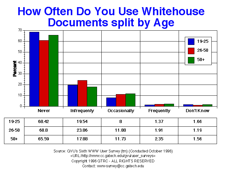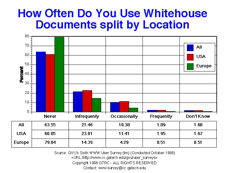 - Almost 2/3 of respondents have never accessed White House documents (63.6%). This percentage is up very slightly from the last survey. Fewer respondents from Europe report using White House documents, which is not surprising. The age group with the most use is 26-50 year olds (36.9% have used at least once).