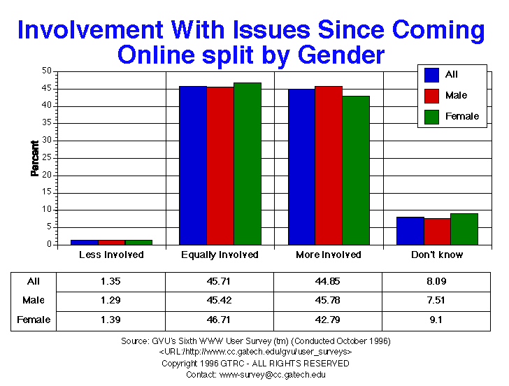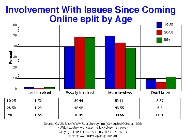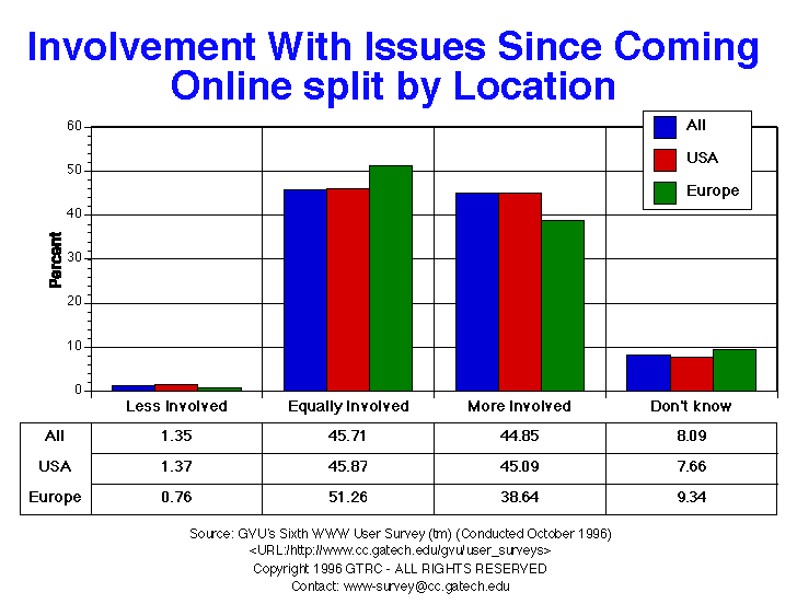 - Slightly less than half of respondents (44.8%) reported being more involved with political issues since coming online, which is a slight increase from the Fifth survey. Almost the same percentage, however, feel that they are equally involved. More European respondents report being equally involved than American respondents. A much higher percentage of younger respondents reported feeling more involved (50.1%) when compared to older respondents (38.7%).