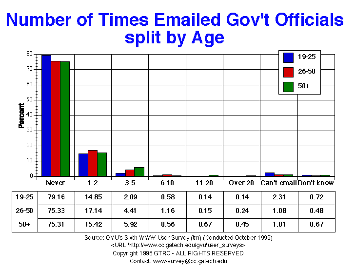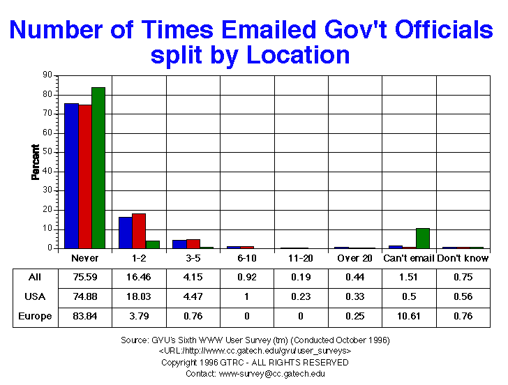 - Most respondents have never written email to a government official (75.6%). This is a slight increase from the last survey. Europeans are even less likely to have written (83.8%).