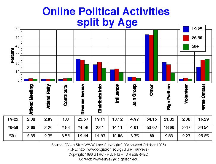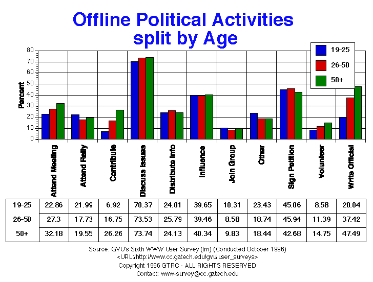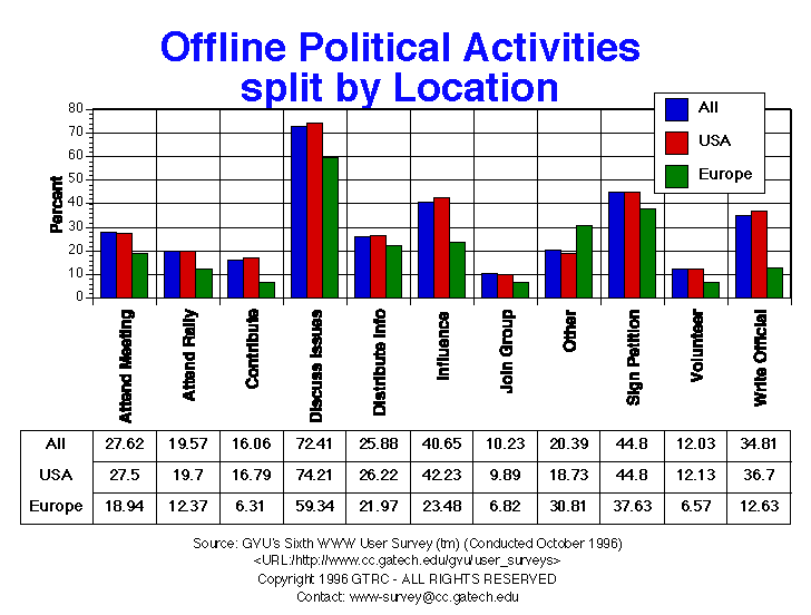 - The most popular offline political activities are: discussing issues (72.4%), signing petitions (44.8%) and influencing others (40.7%). Europeans reported less activity in the categories provided, but reported more activity in "other" political categories. Older respondents were more likely than younger respondents to: write letters, contribute money, attend meetings and volunteer.
