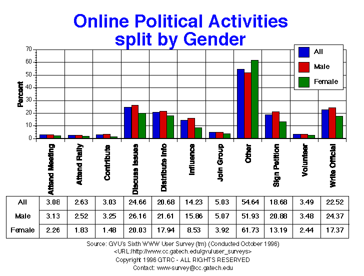 - As with the last survey, the largest category of activity was "other" (54.6%). Of those listed, respondents reported participating in online discussions, distributing information, and writing officials online. Females reported less activity in all categories except "other". Younger respondents were more likely to participate in the various online activities except for writing officials.