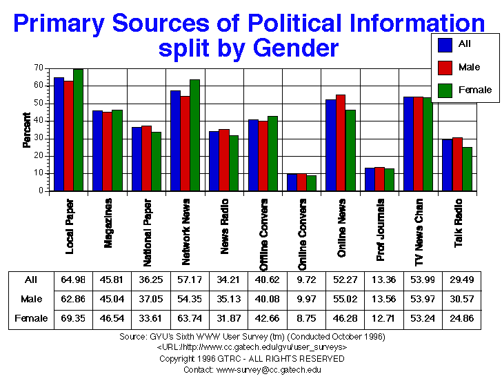 - For this question, respondents could check more than one answer. There were no major differences between these responses and those from the Fifth survey. Primary sources identified by more than 50% of respondents were: local papers, network news, TV news channels (i.e. CNN/MSNBC), and online news. As with the previous survey, national newspapers were the most frequently cited source of political information.