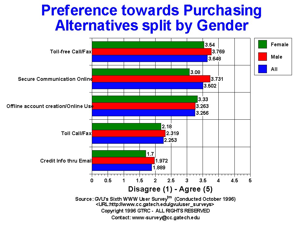 - This question asked users to state their agreement(5)/disagreement(1) on a 5 point scale about providing credit card information through the Web. Overall the trend is towards increased trust in the Web for transactions, though security concerns are a primary reason for not buying on the Web (average 3.39). This sentiment has decreased slightly over the past year, where in the Fourth Survey the average was 3.56. Not purchasing over the Web due to security concerns continues to bother women more than men (3.76 women vs 3.17 men). Providing credit card information through the Web is considered riskier than giving over the phone (3.36), riskier than giving to an unknown store (3.06), and riskier than faxing to an offline vendor (2.95).