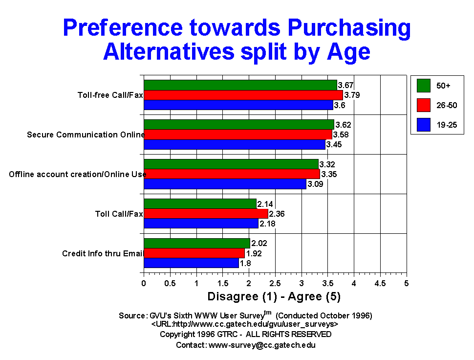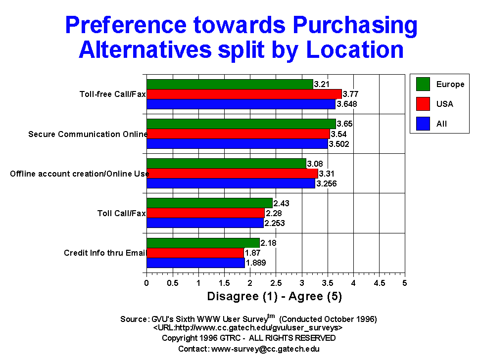 - Toll-free calls/faxes remain the most preferred method for purchasing amongst users. On a 5 point scale with higher numbers indicating greater likelihood of usage, users selected toll-free calls with a rating of 3.648. Secure online communications was just slightly behind with a rating of 3.502. While the overall ranking of methods has not changed since the Fourth Survey a year ago, the difference between the two options has shrunk from 0.400 to only 0.146, indicating that either method would be acceptable to users. Users still have the same avoidance towards passing credit card information through email (1.9 Sixth Survey vs 1.9 Fourth Survey). Likewise, offline account creation supplemented with online purchases is marginally preferred (3.3 Sixth Survey vs 3.3 Fourth Survey). However, this method is still preferred to users having to make a toll call/fax to make purchases (2.3 Sixth Survey vs 2.3 Fourth Survey).