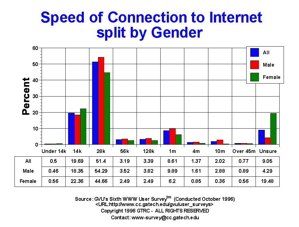 - Modems still dominate the day for Web users, with just over half of the users (51.40%) using 28.8 Kb/sec modems and 19.69% using 14.4 Kb/sec modems. This represents a significant shift from the Fifth survey, where only 39.0% were using 28.8 Kb/sec and 25.5% were using 14.4 Kb/sec modems. The trend for increasing number of respondents connecting at speeds less than or equal to 28.8 Kb/sec is still occurring, with 71.59% of the respondents using 28.8 Kb/sec or less, up from 65.5% in the Fifth and 61% in the Fourth Survey.