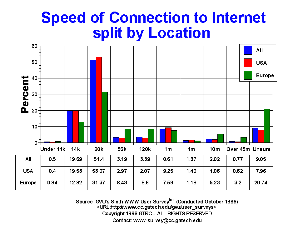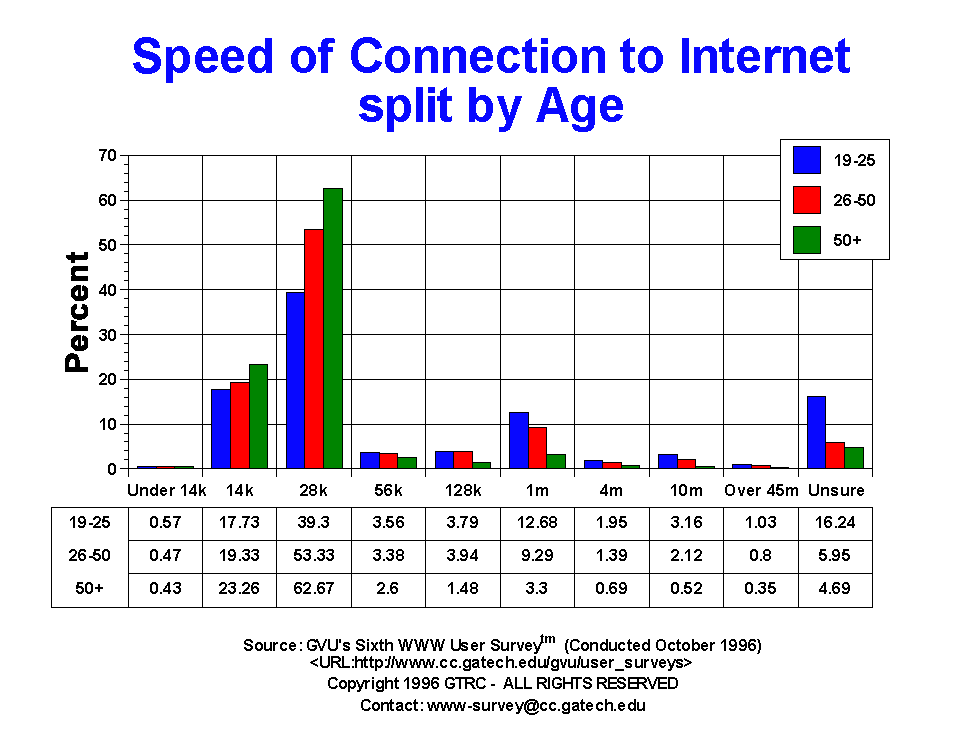 - European respondents, in general, have faster connection speeds. A higher percentage of respondents over age 50 are connecting with speeds under 28.8 Kb/sec (86.3%). Also, a higher percentage of respondents between 19 and 25 years old are unsure of their connection speed (16.24%), though those that do know, report fast speeds, most likely due to educational infrastructures of over 1 Mb/sec. These differences across strata are basically identical to the Fifth survey indicating relative stability in this characteristic.