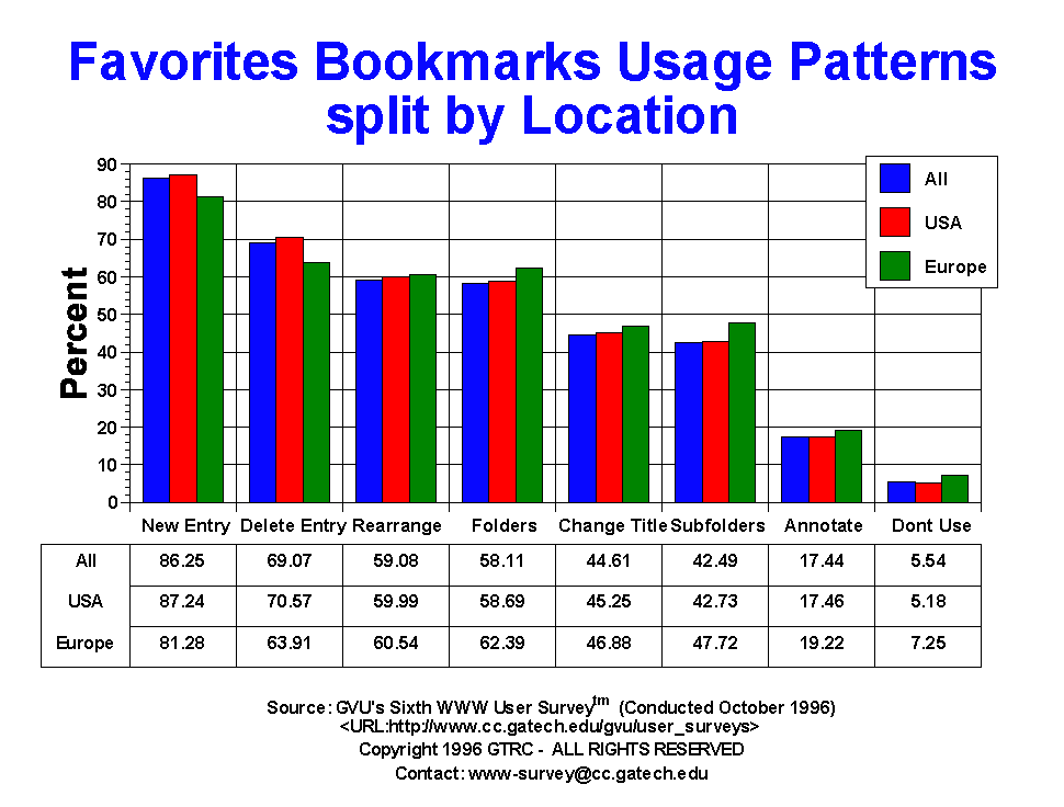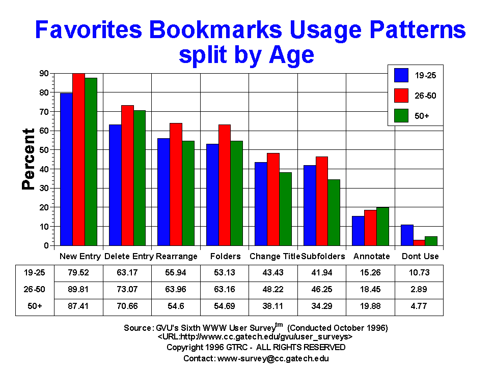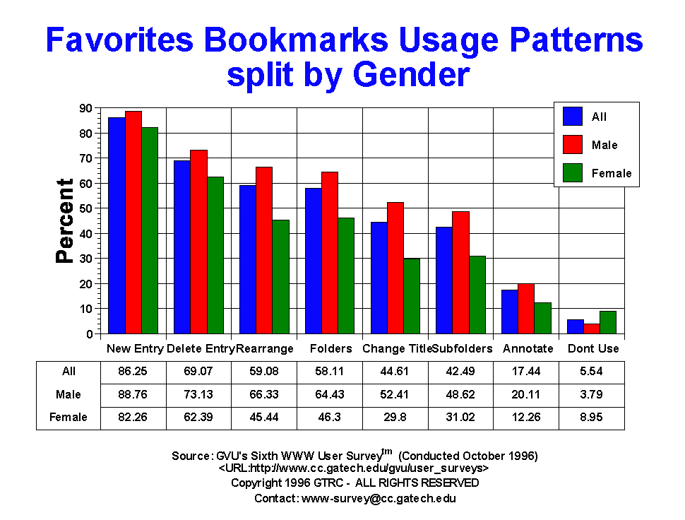 - The purpose of this question is to begin to understand what behaviors people use to manage their personal Web information via favorites/bookmarks. This is a new question to the surveys, originally developed by David Abrams of the University of Toronto as part of his research into personal information management. Nearly all users (86.25%) create new entries, with 69.07% deleting entries and 59.08% rearranging entries. Slightly more than half of the users (58.11%) create folders, with 42.49% creating sub-folders (folders within folders). A fair number of users change the titles of their entries (44.61%) though not may users annotate entires (17.44%). Only 5.54% claim not to use this facility of the browser. Males engage in more favorite/bookmark activities than females. The baby boomers, 25-50 yr olds, who have more items in their bookmarks also tend to utilize more aspects of favorite/bookmark functionality.