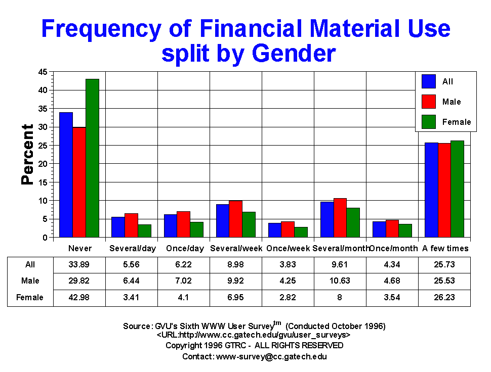 - Just over a third of respondents (33.89%) reported that they never use the Web to find economic information. This translates to an increase of 5 percentage points in the amount of users accessing financial data online since the Fifth Survey where 38.0% had never accessed financial data online. Part of this increase was in daily users, where 11.78% of the users currently access this information compared to 8.96 in the Fifth Survey. More females than males report never having used the Web for economic information (42.98% female vs 29.82% male), which is much less than the Fifth Survey (49.9% females, 32.6% males).