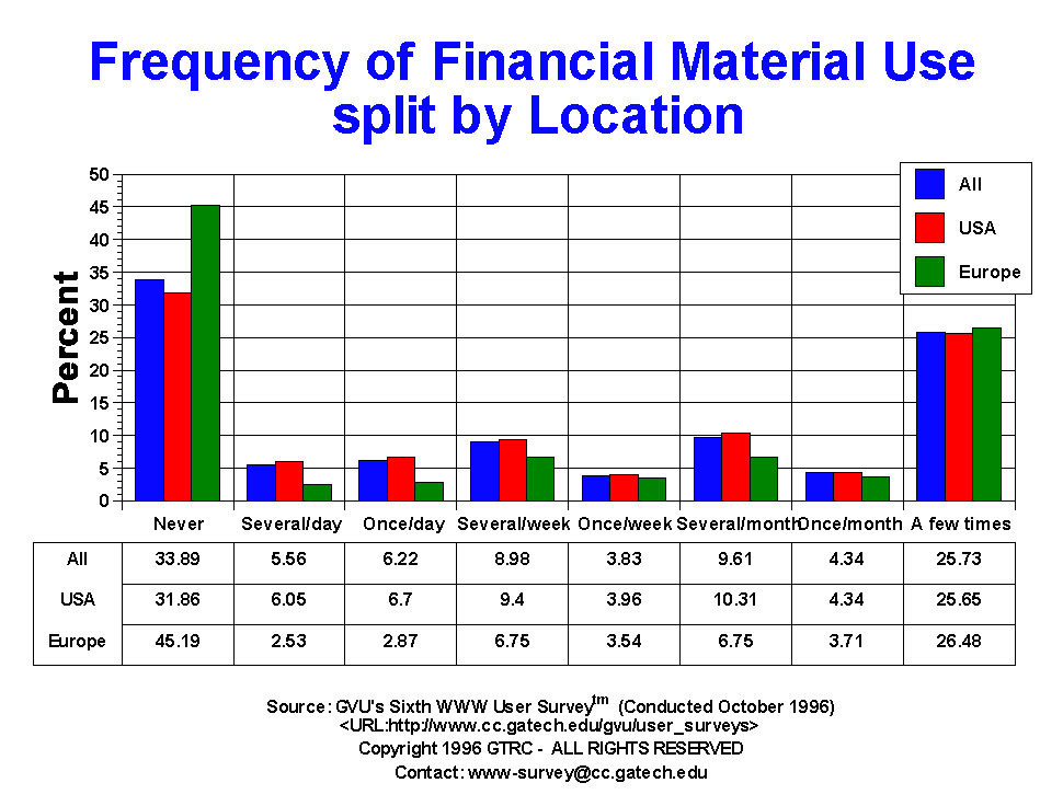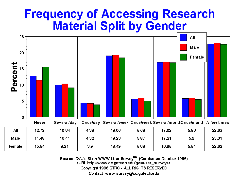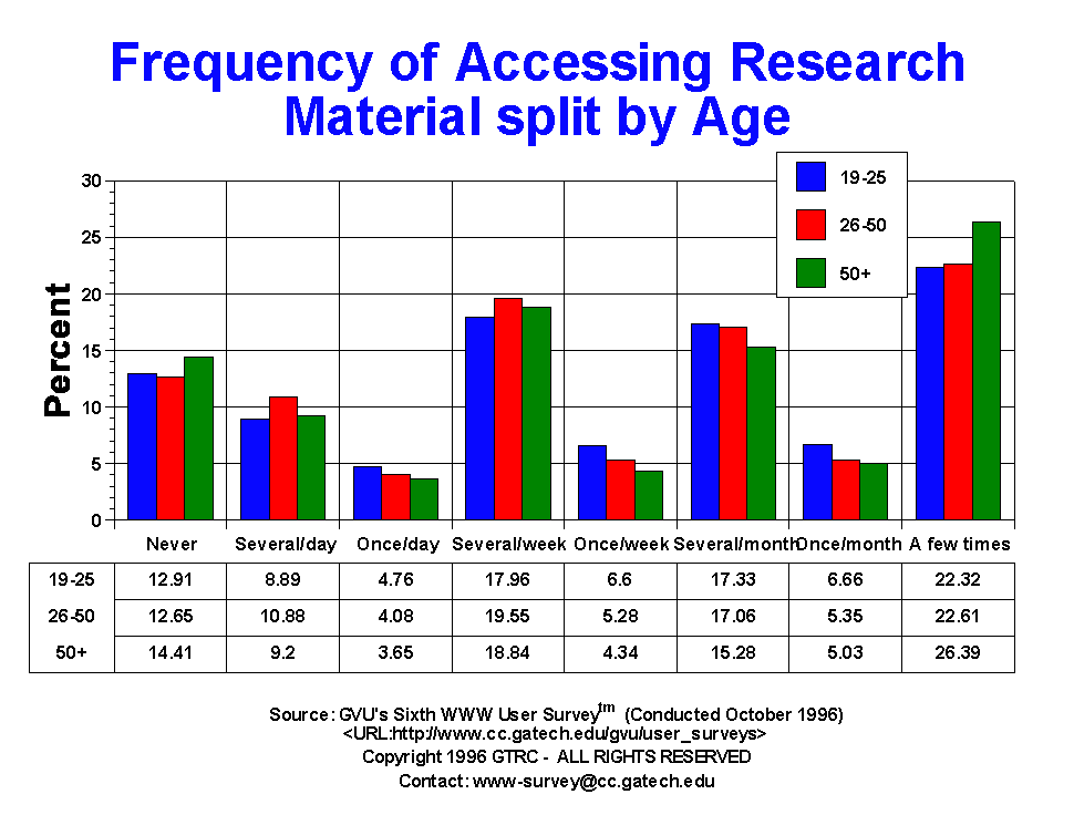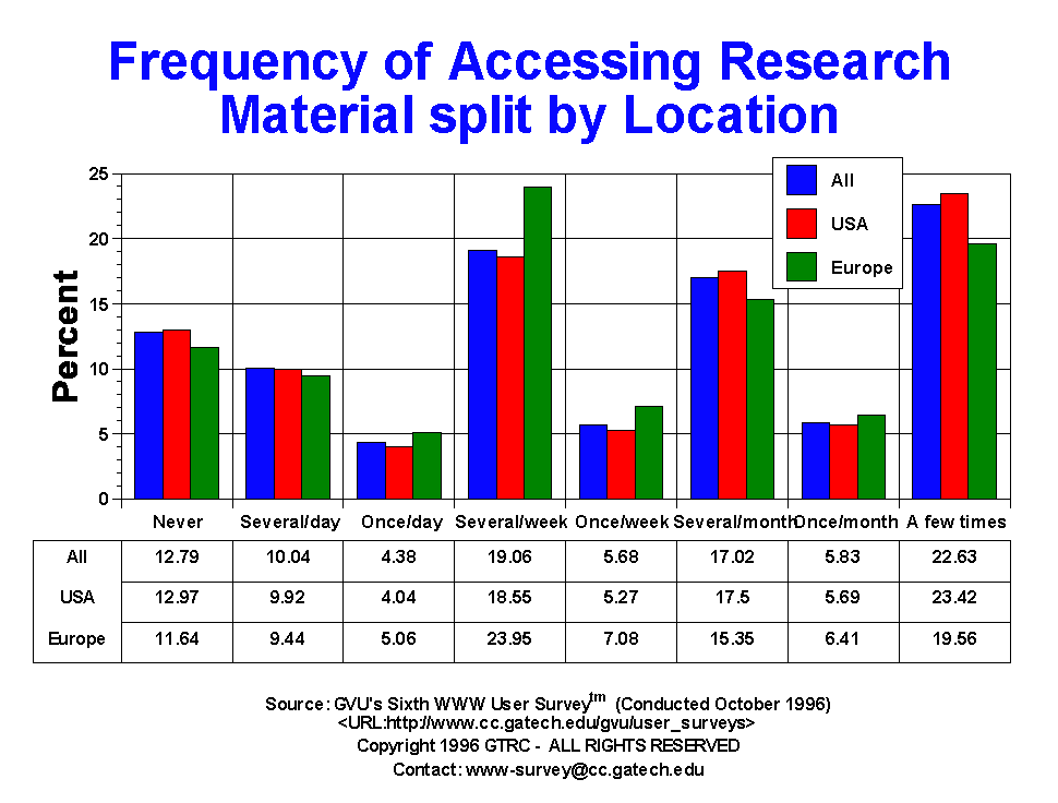 - A quarter of the respondents (22.5%) reported using research information "a few times", with only 12.79% reported having never used online research information via the WWW. 39.16% of the users reported using research material at least weekly. European respondents reported more frequent use of research information. Males and the 26-50 yr olds are more likely to access this type of information than their counterparts.