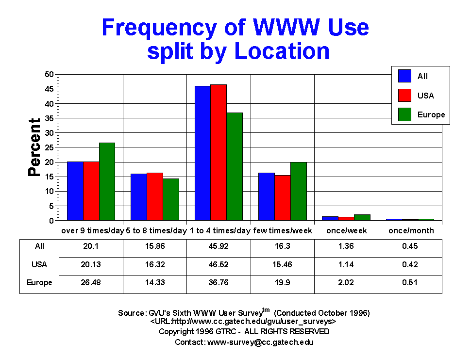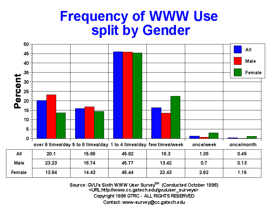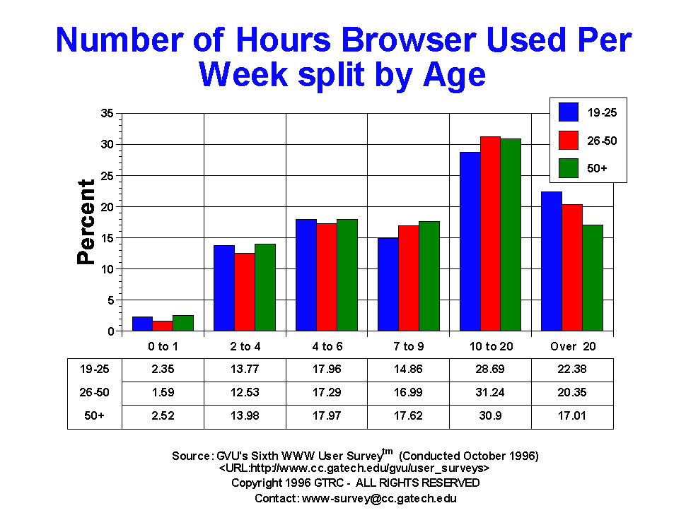 - While the number of times browsers are used per day has remained stable since the last survey, the number of hours people user the Web has increased, with one in five users (20.05%) reporting using their browsers over 20 hours per week. Just about one third (30.01%) spend 10 to 20 hours a week on the Web, with 17% spending 7 to 9 hrs/wk and 17.76% spending 4 to 6 hrs/wk. Casual use of under 5 hours per week is down from 16.87% in the Fifth Survey to 15.18%, further emphasizing the trend towards increased usage. For comparison, in the Third Survey conducted in April of 1995, only 28.46% of the users spent more than 10 hrs/wk on the Web. Eighteen months later, nearly twice as many users (50.06%) spend more than 10 hrs/wk! US, female, and older users are more likely to spend less time on the Web than their counterparts.