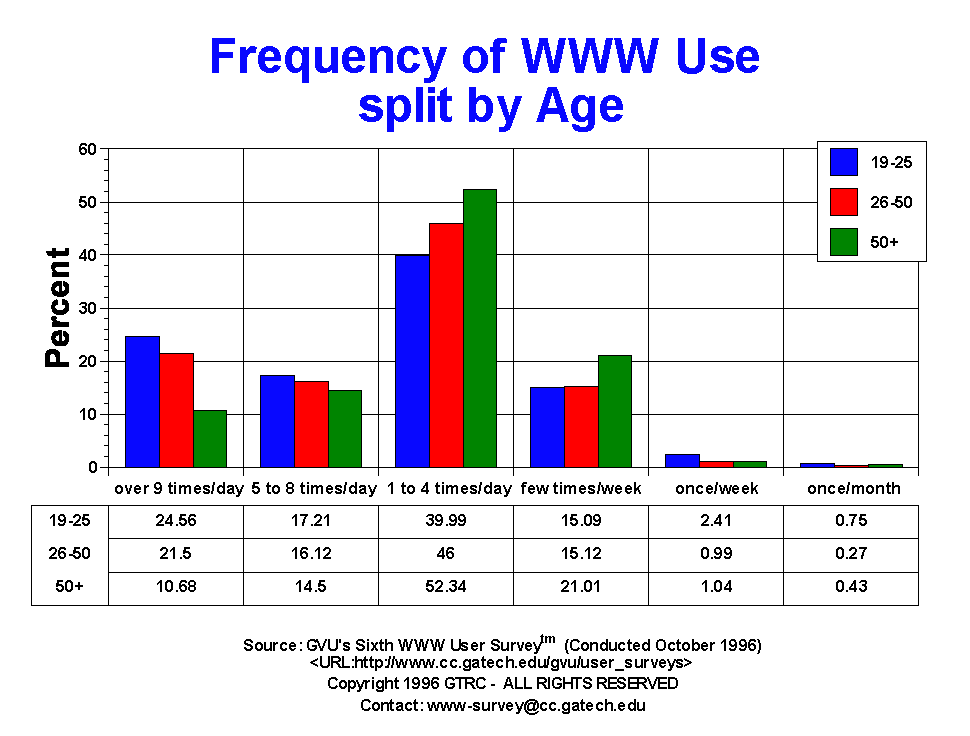 - As with the Fifth Survey, males reported slightly more work-related uses of the Web: work (53.18%) and business research (44.61%) while females reported more educational uses (58.46%). Also mirroring the findings of the Fifth Survey, the 26-50 age group reported significantly more work (58.11%) and business research (47.99%) being done on the Web than other age groups. Those aged 19-25 report more entertainment uses (75.85%) and academic research (51.18%).