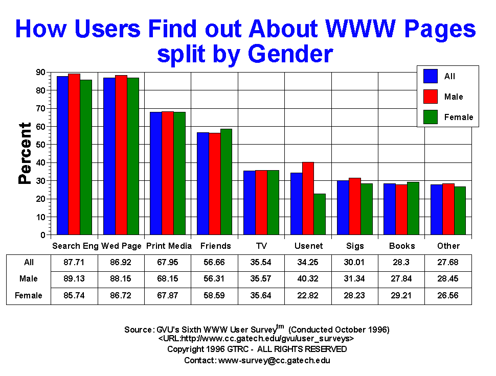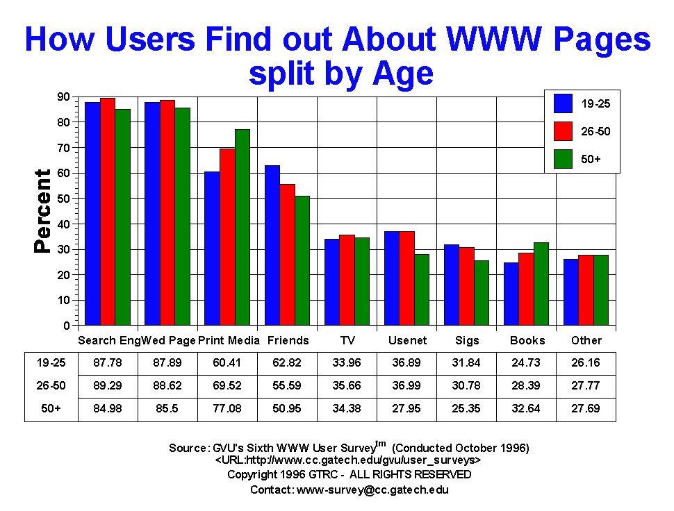 - For this question, users were allowed to mark more than one answer. The primary method people find out about other sites is via search engines (87.71%) and other Web pages (86.92%). This is a reversal from the Fifth Survey, where 90.7% reported finding out about Web pages from other Web pages and 83.1% from search engines. Printed media (67.95%), friends (56.66%), TV (35.54%) and Usenet Newsgroups (34.25%) remain other popular methods for finding out about other pages, though the use of Usenet has declined 10 percentage points from the Fifth Survey (44.4%). The younger generation is more likely to find out about other pages from friends, while the older generation make more use of printed media.