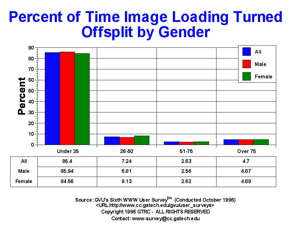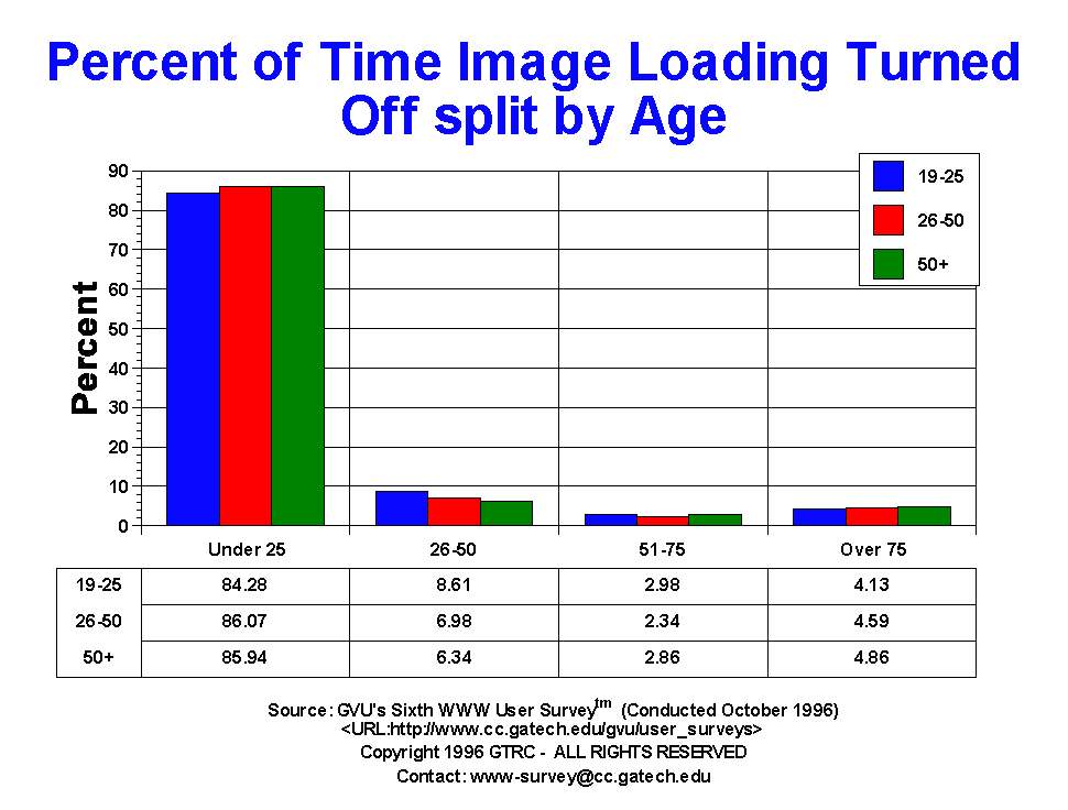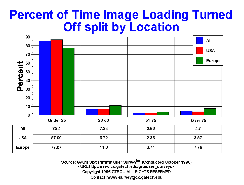- This is a new question to the surveys, but one that we've been meaning to ask for quite some time due to the numerous queries we field about how often people surf without images being loaded for each page automatically. This is a big concern for graphic designers who are faced with the opposing goals of producing media rich content that everyone can access quickly. Most people surf with images loaded automatically as 85.40% report turning image loading off under 25% of the time. The remaining 14.57% report not loading image anywhere from 26 to 100% of the time. As one might expect due to the slow transoceanic connection between US and Europe, more Europeans turn image loading off. Differences between gender and age were not observed.