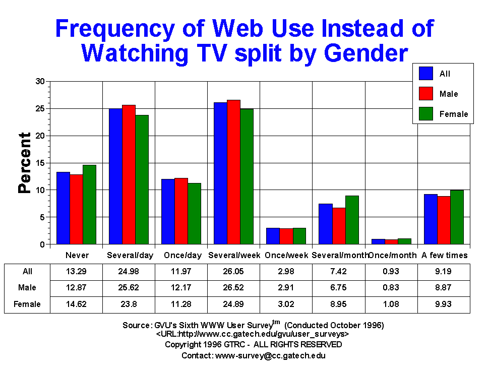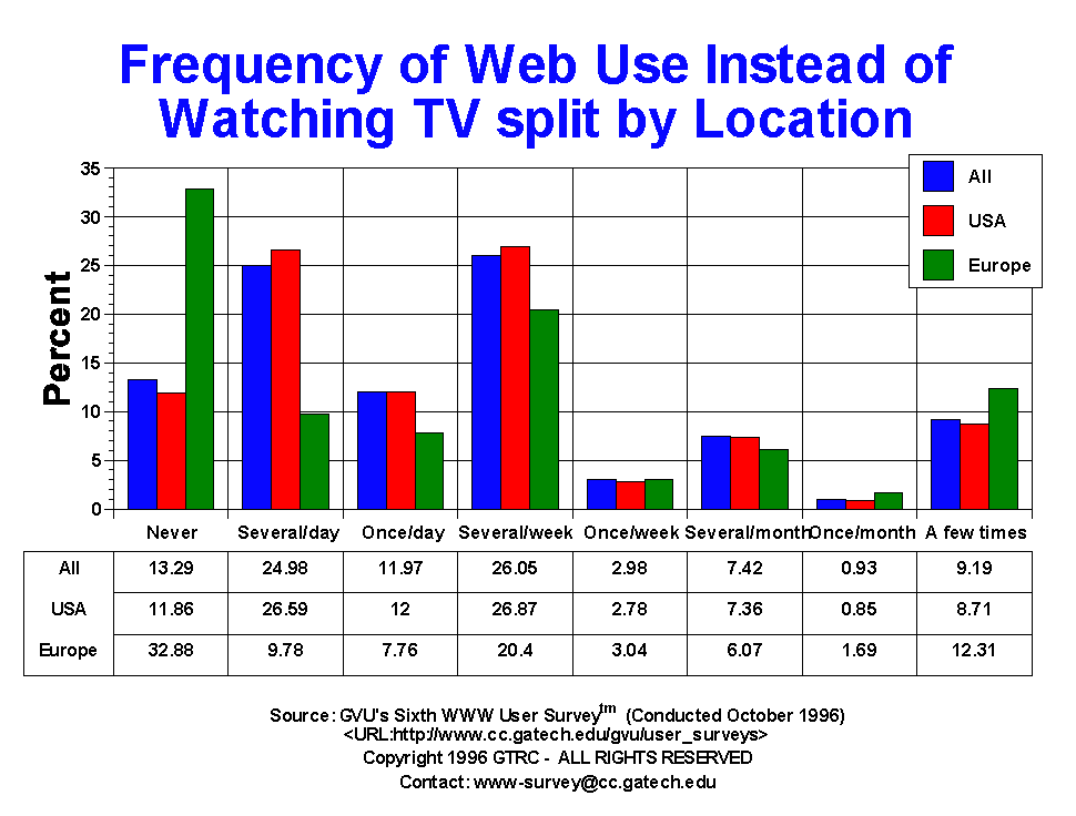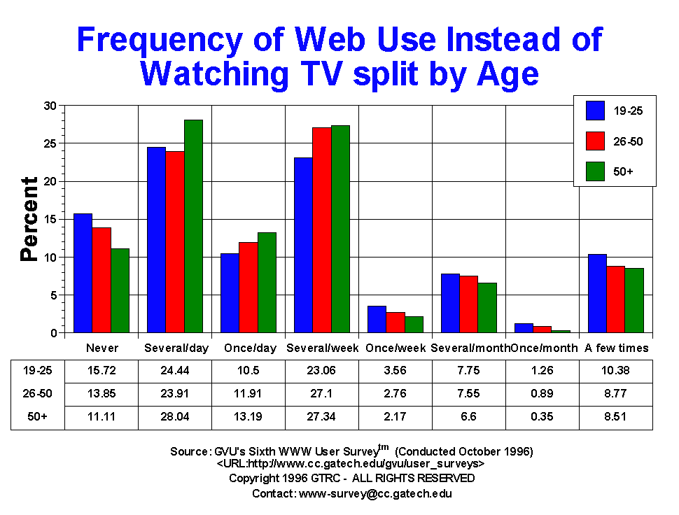 - Almost 37% of respondents claim that they use the Web instead of watching TV on a daily basis. An additional 29.03% say the Web replaces TV on a weekly basis, usually more than once a week. This pattern almost exactly mirrors the pattern found in the Fifth Survey. These number when used in conjunction with the use of the email as being on equal par with the phone paint a tremendously strong picture of the rapid integration of the Internet and World Wide Web into the fabric of the lives of those who currently use it. This is truly an amazing time.