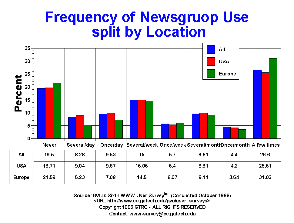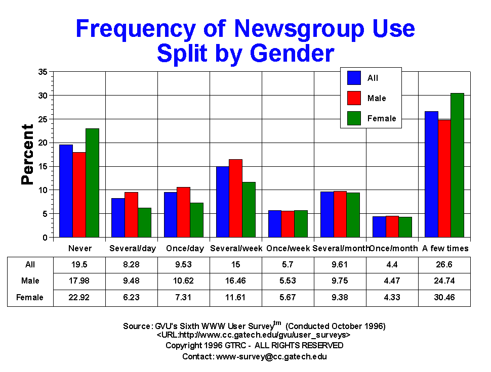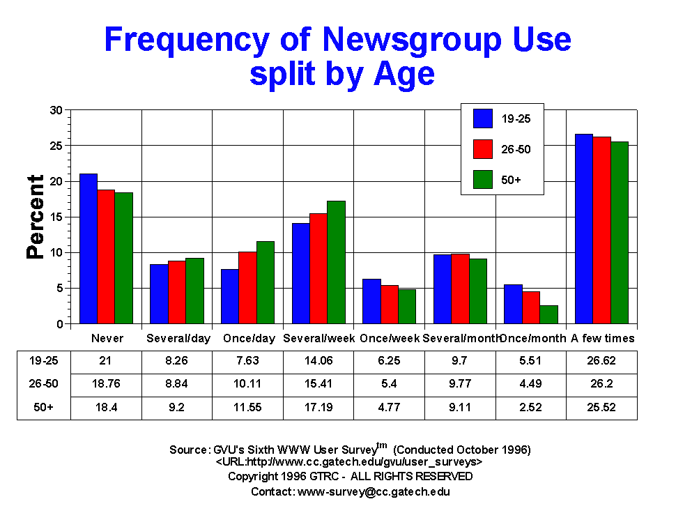 - Just about one third of the users (32.81%) access Usenet Newsgroups at least weekly, with 46.1% either having never access newsgroups of only accessed them a few times. This distribution of usage is quite similar to the Fifth Survey. Females and the 19 - 25 yr old group tend to access newsgroups less frequency than their counterparts.