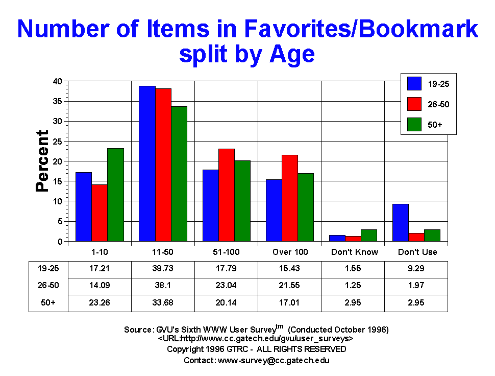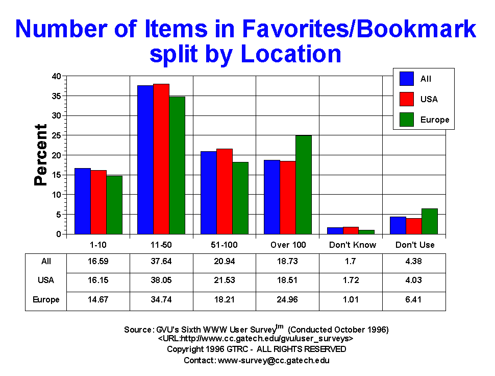 - The largest category of users has 11-50 items in their favorites/bookmarks (37.64%), and 77.3% have over 11 items. The percentage of respondents with over 100 items in their favorites/bookmarks is 18.7. The distribution of items is nearly identical to the distribution in the Fourth Survey. As in the Fifth and Fourth Surveys, more European respondents than US respondents had over 100 items in their hotlist (24.96% Europe, 18.51% US). In general, females have fewer items than males, The respondents with the highest number of items in their favorites/bookmarks are users in the 26-50 age range: 44.59% have over 51 items in their list.