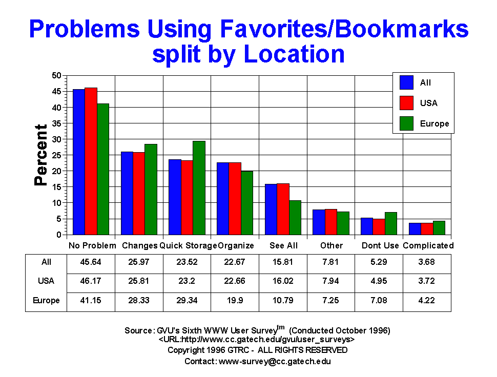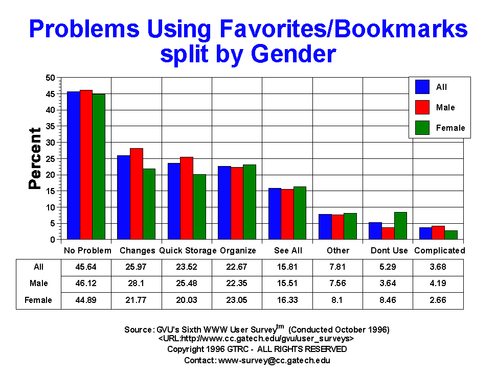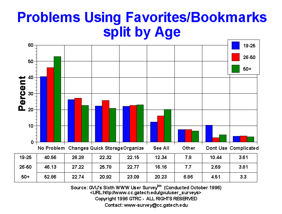 - Everyone complains about how difficult it is to manage all the information found on the Web, but exactly what are their complaints about? This is a new question to the surveys, originally developed by David Abrams of the University of Toronto as part of his research into personal information management. Users were able to select more than one answer to this question. A fair number of users claim not to experience any difficulties using favorites/bookmarks (45.64%), though if the number is reversed and non-users excluded, half of the users do have problems using favorites/bookmarks! The biggest problem is in making changes (25.97%). About one in four users complain that they are not able to quickly store items away (23.52%) and organize the contents (22.67%). Another 15.81% expressed that the inability to see all the content of their favorites/bookmarks was a problem. The 50+ yr olds (52.86%) were more likely to not think there was a problem with using the facilities than the 19-25 yr olds (40.45%).
