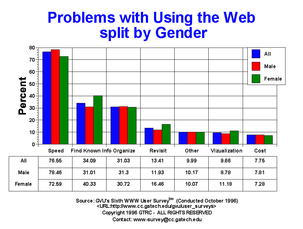 - The next big problems are "finding known info" (34.09%), organizing collected information (31.03%), and being able to find pages already visited (13.41%). Cost does not seem to be an issue, with only 7.75% reporting this as a problem. Given that the average household income of Web users is well above the normal population, this is not very surprising and cannot be taken to mean that the Web is currently affordable for all. The only notable difference between genders was the problem of finding information: 31.01% of males, and 40.33% of females reported this problem. This difference was found in the Fifth Survey as well. No major differences were reported across age groups.