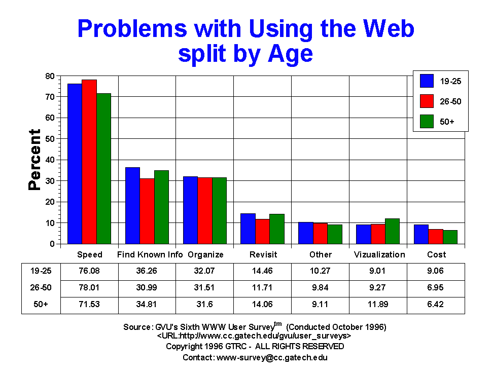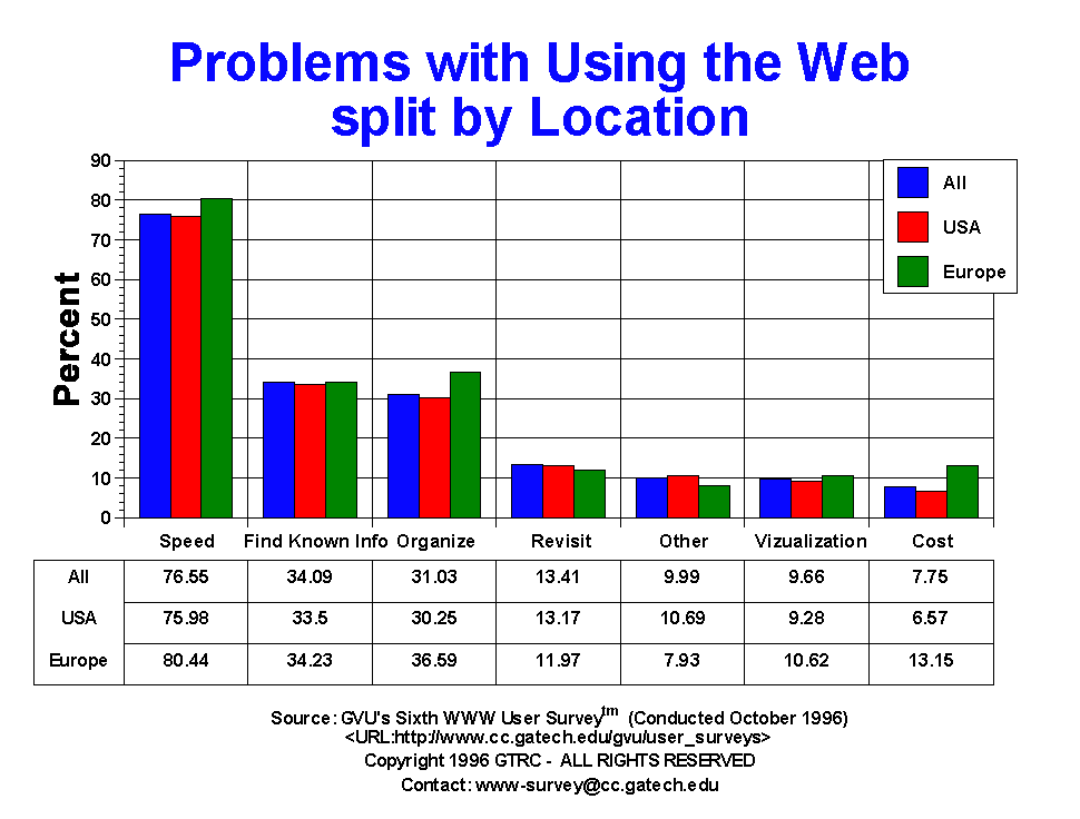 - Speed continues to be the number one problem of Web users (76.55%), and has been since the Fourth Survey when the question was first introduced. This is not to say that the problem has been getting worse, as the number who complained of speed is down from 80.9% in the Fifth Survey, but still higher than the 69.9% in the Fourth. This effect is most likely due the the changes in connect speed of users to the Internet (See: Connection Speed).
