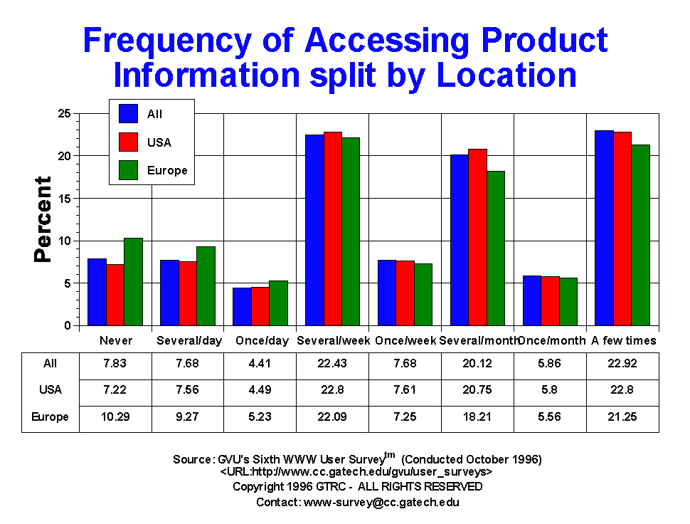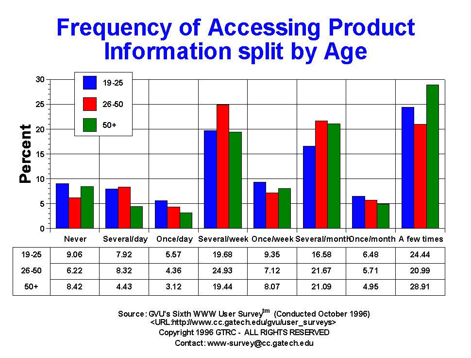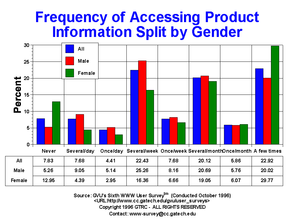 - Product information remains one of the most popular types of information accessed. A surprisingly small 7.83% have never accessed product information on the Web, while 30.1% access it on a weekly basis and 25.89% on a monthly basis. This is nearly the exact distribution as found in the Fifth Survey indicating the stead-fast utility of the Web for production information gathering. Males access product information more regularly than females do: 33.42% of males access it on a weekly basis compared to only 23.02%% of females. This does represent a 3 percentage point increase in weekly access of product information by females. Only 12.95% of females have never accessed product information on the Web, a 3 percentage point decrease since the last survey. There are still no clear trends for use of product information with respect to age, although there are noticeable differences in many of the frequency categories.