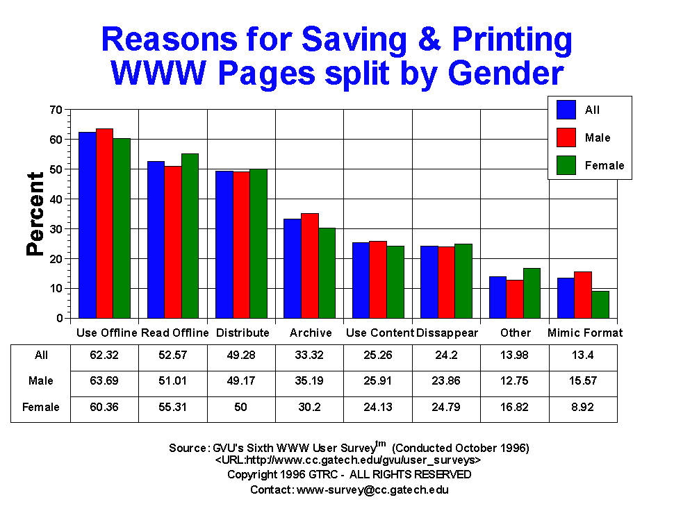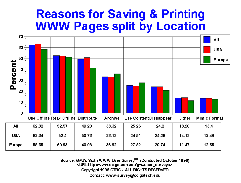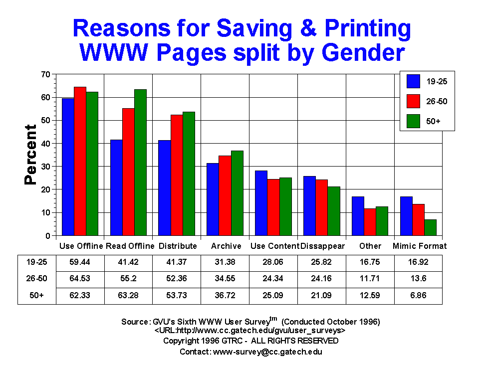 - For this question, users could mark more than one answer. By far the most widely cited reason for save and printing documents is to use them off line (62.32%). Not surprising given the poor resolution of current monitors, 52.57% store/print documents to read offline. There seems to be a far amount of sharing of the online world with those without access, as 49.28% distribute the documents to others not online. This ranking and percentages are nearly identical to the Fifth Survey. One area that showed a slight increase was in the saving/printing of documents for archival purposes and due to fear that the content would disappear (24.20%). The 19-25 generation us less likely to read the content offline (41.42% 19-25 vs 63.28% 50+), but more likely to mimic the format used in other pages.