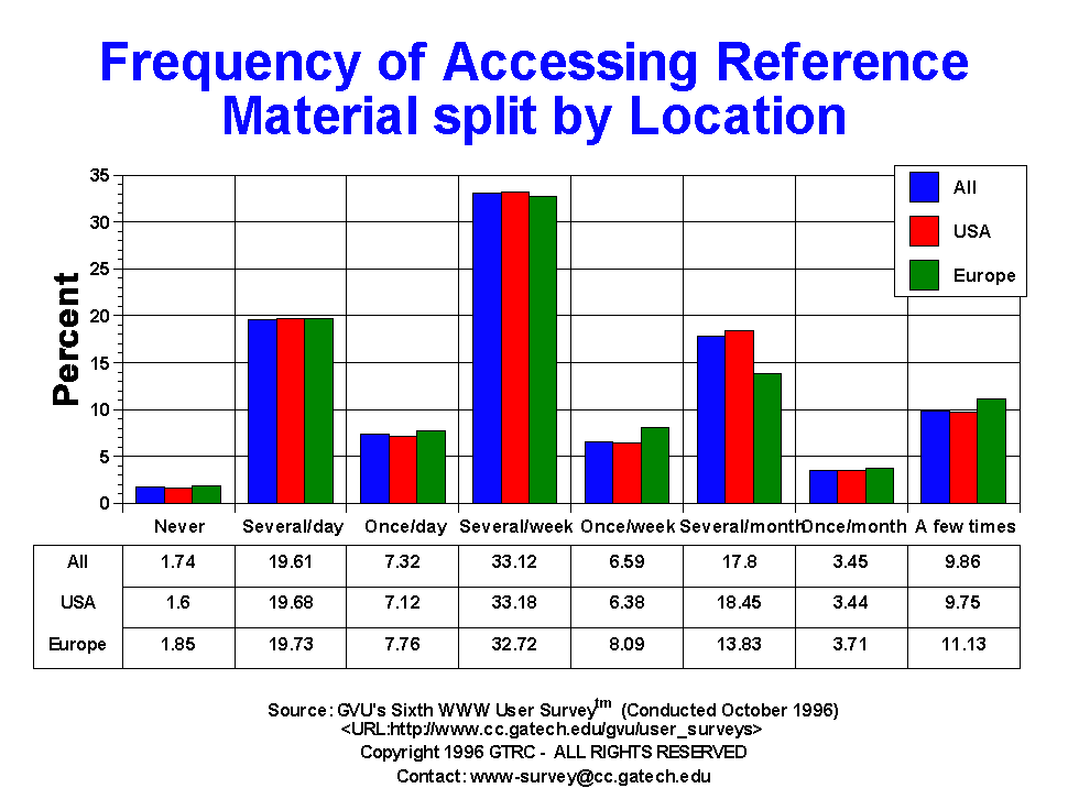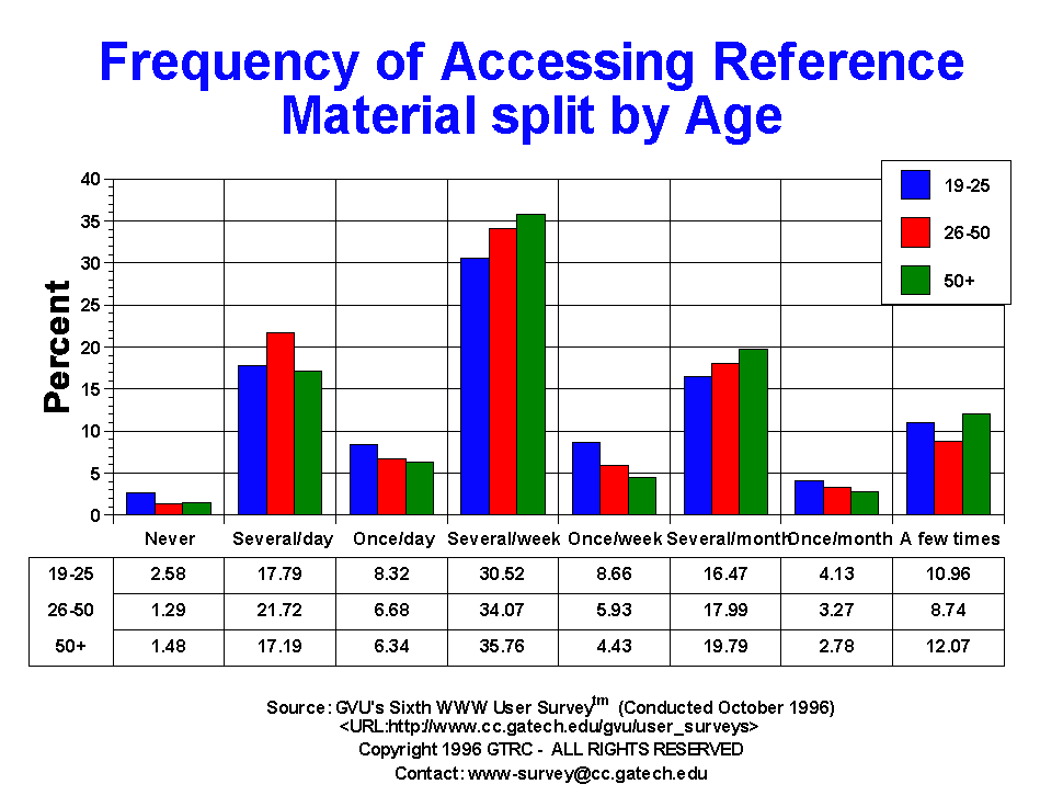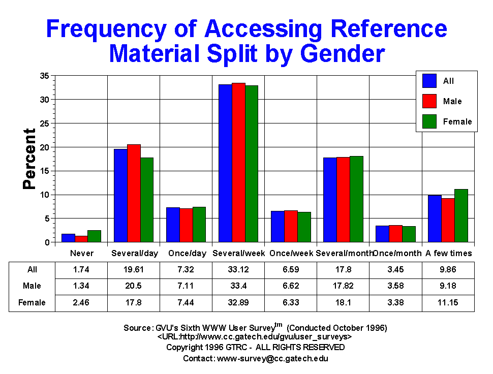 - Reference information continues to be the most frequently accessed category of those we inquired about. 19.61% of respondents reported using reference information on a daily basis and 39.71% use it on a weekly basis, up from 33.8% n the Fifth Survey. Only 1.74% have never accessed reference information on the Web! It seems reasonable that part of the reason for the increase in the number of hours people use the Web is reflected in the increased utility as measured by accessing reference material. Note that this is an area that is highly dependent upon useful content, much of which is has seriously started to emerge. The world of information has essentially become one's bookshelf (well almost). There is little difference across gender in the use of reference material.