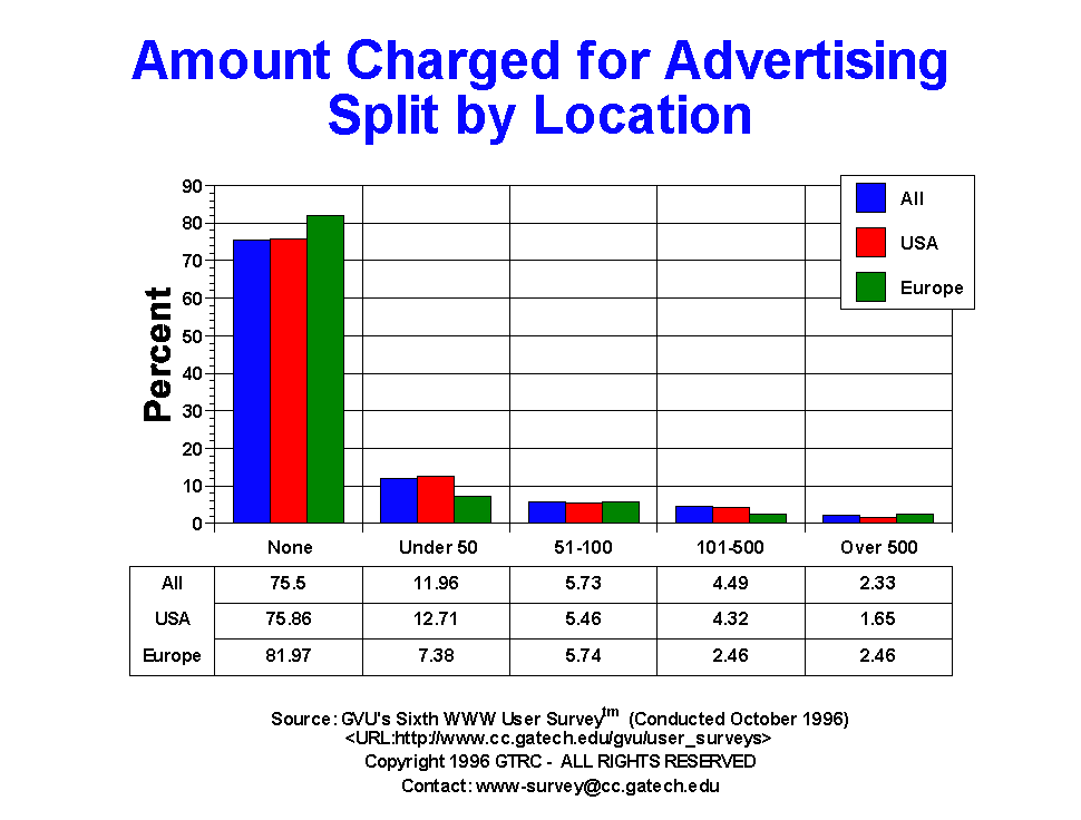 - Three out of four Webmasters (75.5%) report that they do not provide advertising on their sites. 6.8% report charging more than $100/week. While this may not seem like a large number of sites, it is more than a 600% increase when compared to the Third Survey a year and a half ago, where only 1% charged this much for advertising.