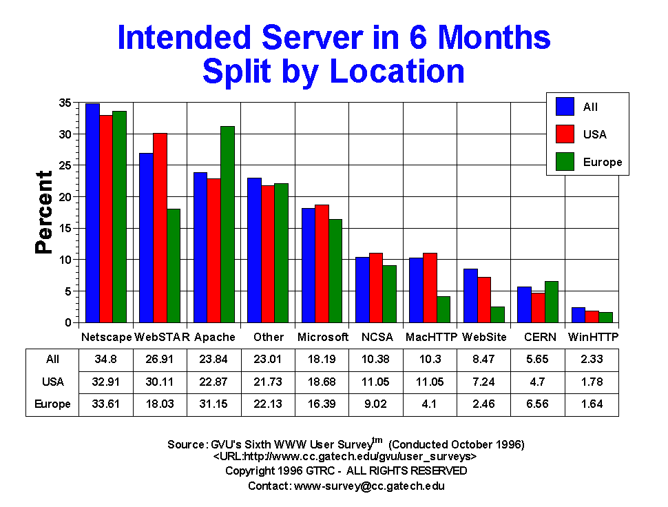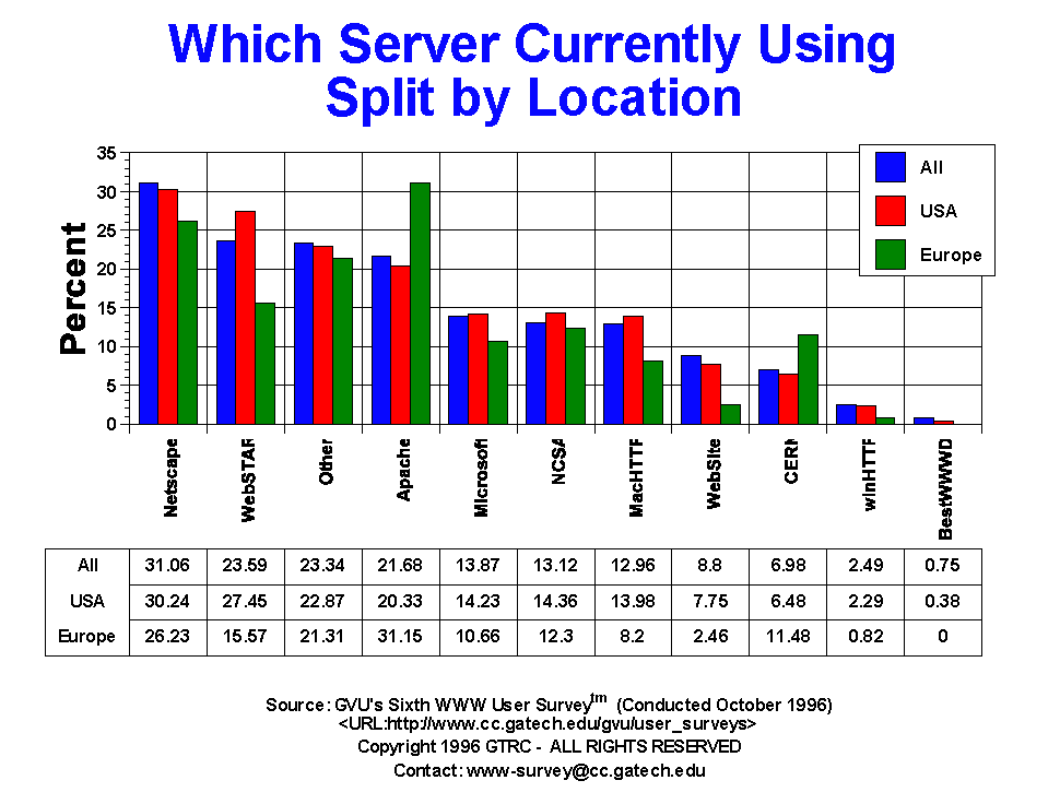 - The server used most by the respondents is Netscape (31.06%), followed by WebSTAR(23.59%), Other (23.34%), Apache (21.68%), Microsoft (13.87%), NCSA (13.12%), MacHTTP (12.69%), Website (8.8%), CERN (6.89%) and winHTTP (2.49%). While this distribution has strong similarity to the Fifth Survey, where Netscape lead the pack with 30.3% followed closely by NCSA (25.5%) and WebSTAR (24.7%), this distribution does not mirror other surveys of Web servers, in particular Netcraft's Survey of HTTP Server. Netcraft's survey asks it's database of over 500,000 servers what software it is running. Their most recent results place Apache with 41%, Netscape with 13%, NCSA with 13%, and Microsoft with 10%. There are several reasons why our survey differs from theirs. The most important reason has to do with the non-random sampling and self-selection issues explained in the Sixth Survey's discussion of methodology. This reduces the ability of our results to generalize to the entire server population. However, Netcraft's methodology has trouble with virtual hosting and load balancing. The jury is still out on this one.
