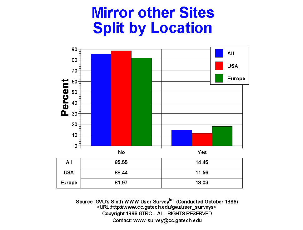 - The majority of sites do not operate mirrors (85.55%) or proxies (73.92%). This is a very stable characteristics with little growth over the years. In the Third Survey (April 1995) only a small percentage of users (12.63%) operated a proxy server or mirrored sites (8.55%) then as well.