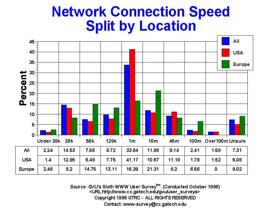 - A third of the Webmasters (33.64%) report that the connection of their server to the Internet is 1 Mb/sec. The next most common connection speed is 28 Kb/sec (14.53%) followed by 10 Mb/sec (11.88%), 128 Kb/sec (9.72%) and 45 Mb/sec (9.14%). This pattern of a large number of users with fast 1 Mb/sec connections and the rest spread out fairly equally on the slower and faster connections is continuance of a trend towards slower server connection speeds. In the Fifth Survey, 37.1% had 1Mb/sec connections, with the next most common being 10Mb/sec (19.8%). Modems accounted for under 10% of the connection speeds in the Fifth Survey compared to close to 18% in the Sixth Survey. In the Third Survey, the most common server connection speed was 10 Mb/sec (38.94%) followed by 1 Mb/sec with 12.88% and 56 Kb/sec with 11.08%.i In the Second Survey (October 1994), 54% reported connection speeds of 1 Mb/sec!