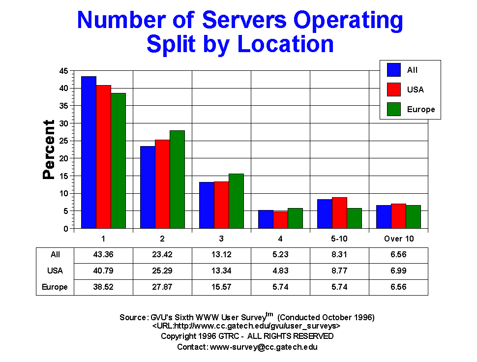 - The majority of Webmasters report operating one server (43.36%), with 23.42% operating 2, 13.12% operating 3, and 6.56% operating more than 10 servers (a 2% increase over the Fifth Survey). European Webmasters are more likely to operate more servers than US Webmasters.