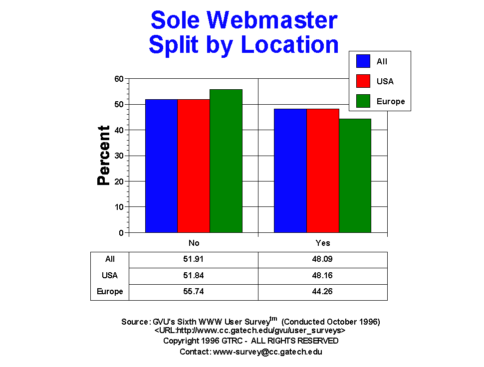 - This is a new question to the surveys. Over half of the Webmasters share the position with other people (51.91%). Europeans share the responsibility of Webmaster (55.74%) more so than US Webmasters (51.84%).