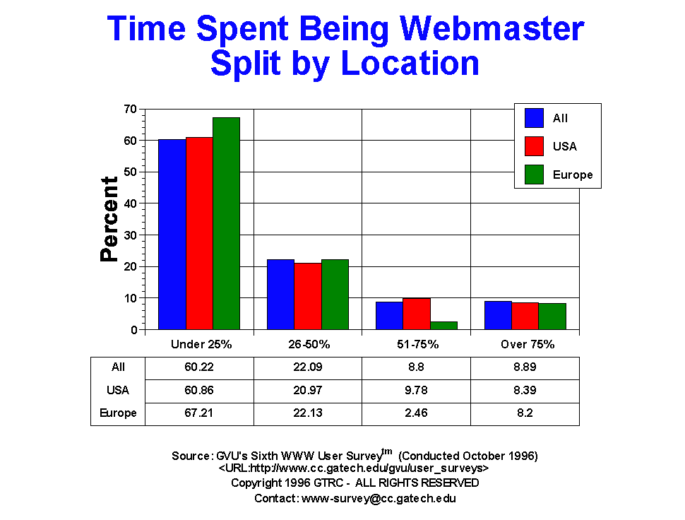 - This is the first time we asked this question. The majority of Webmasters spend under 25% of their time performing Webmaster duties. Only 8.89% report spending over 75% of their time as Webmaster. US Webmasters typically spend more of their time as Webmasters than their European counterparts. While the role of Webmaster is a very new position significant portions of worker's time is spent performing Webmaster tasks, especially in the US.