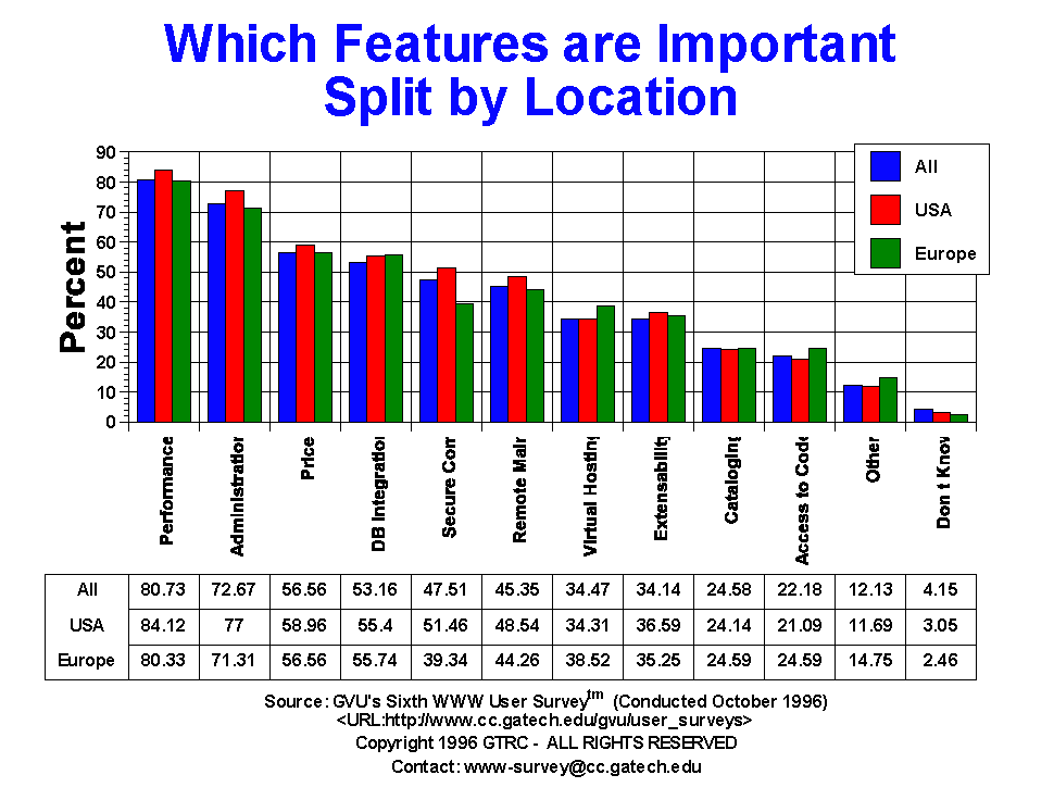 - Respondents were allowed to mark more than one answer. The most important feature in selecting a Web server is performance (80.73%), followed by ease of administration (72.67%), price (56.56%), database integration (53.16%), and secure communications (47.51%). While the percentages have shifted slightly upward for most features since the Fifth Survey, the ranking of the top five features has remained the same. Virtual hosting increased though in importance from 9th at 28.66% in the Fifth Survey to 7th at 34.34% in the Sixth Survey. European Webmasters are not as concerned about features as US Webmasters.