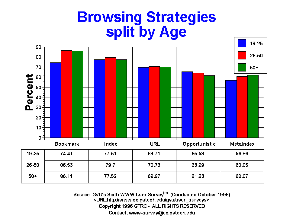 Younger users are less likely to use bookmarks (74.41% 19-25 vs 86.11% 50+),